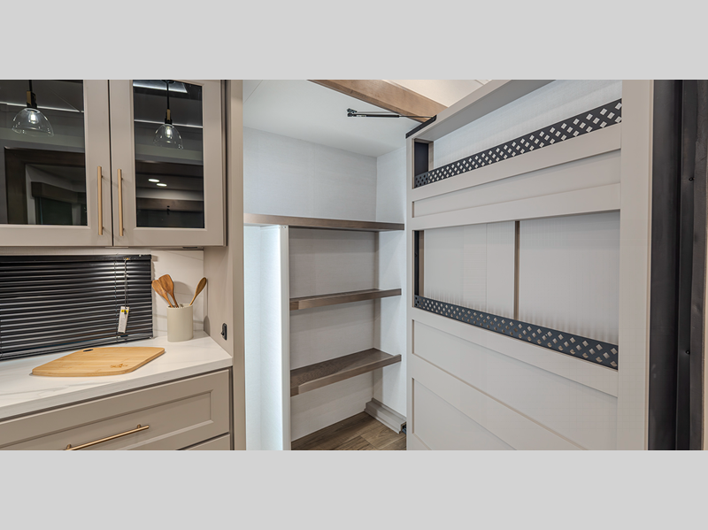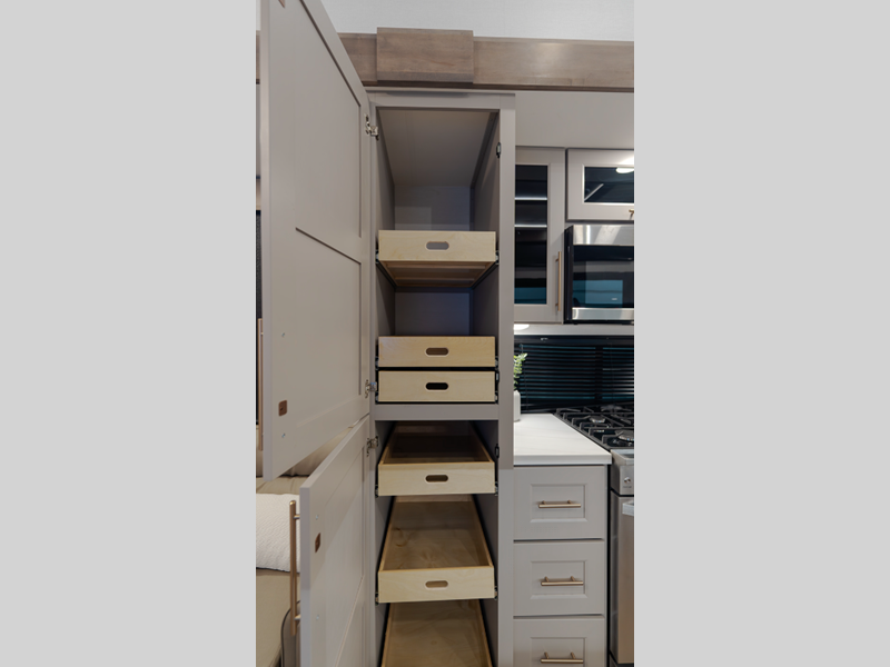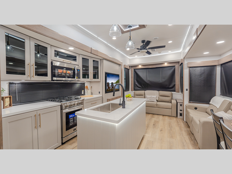 Inside, you'll enjoy residential features, such as solid surface countertops throughout, hardwood cabinetry, dimmer lights throughout, and day/night shades with power blinds for the upper window. Each model is built with Azdel composite fiberglass sidewalls, along with a high gloss fiberglass exterior and oversized atrium windows to let natural light in.