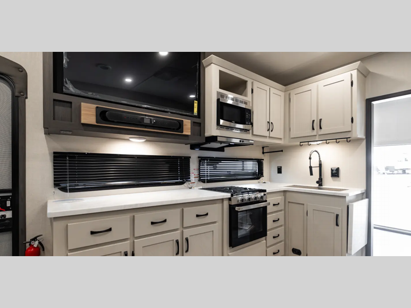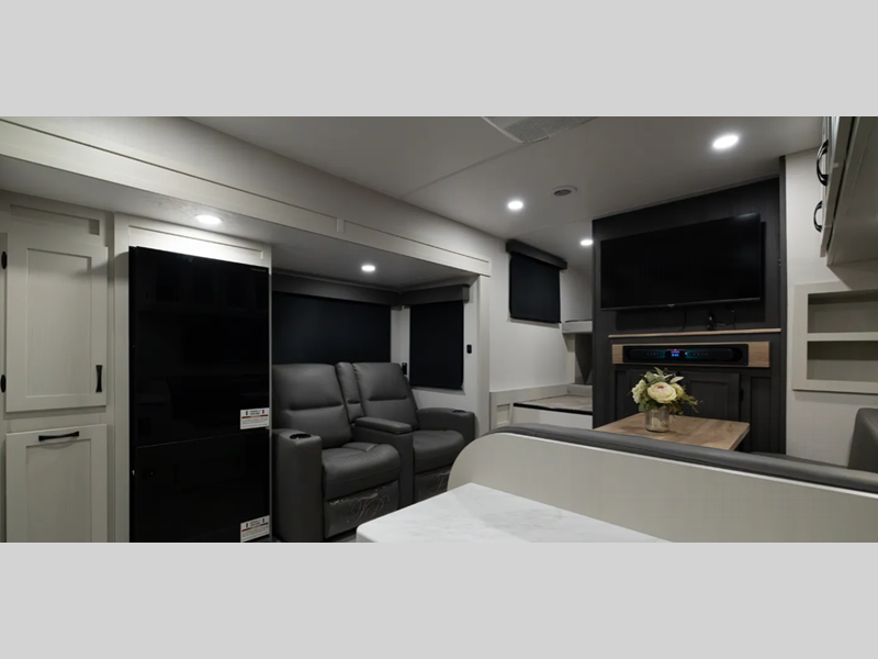 Sleeps 4 Slides 3 Length 34 ft 2 in Ext Width 8 ft Ext Height 12 ft Interior Color Linen, Carbon Hitch Weight 1445 lbs GVWR 11000 lbs Dry Weight 8980 lbs Cargo Capacity 2020 lbs Fresh Water Capacity 40 gals Grey Water Capacity 66 gals Black Water Capacity 33 gals Available Beds Queen Refrigerator Type GE Dual Swing 12V Refrigerator Size 10 cu ft Number of Awnings 1 Water Heater Type On Demand AC BTU 13500 btu TV Info LR 50" 4K Smart LED TV Awning Info 11' Electric w/LED Light Strip and Pitch Adjustment Axle Count 2 Shower Type Radius Electrical Service 50 amp Similar Floorplans