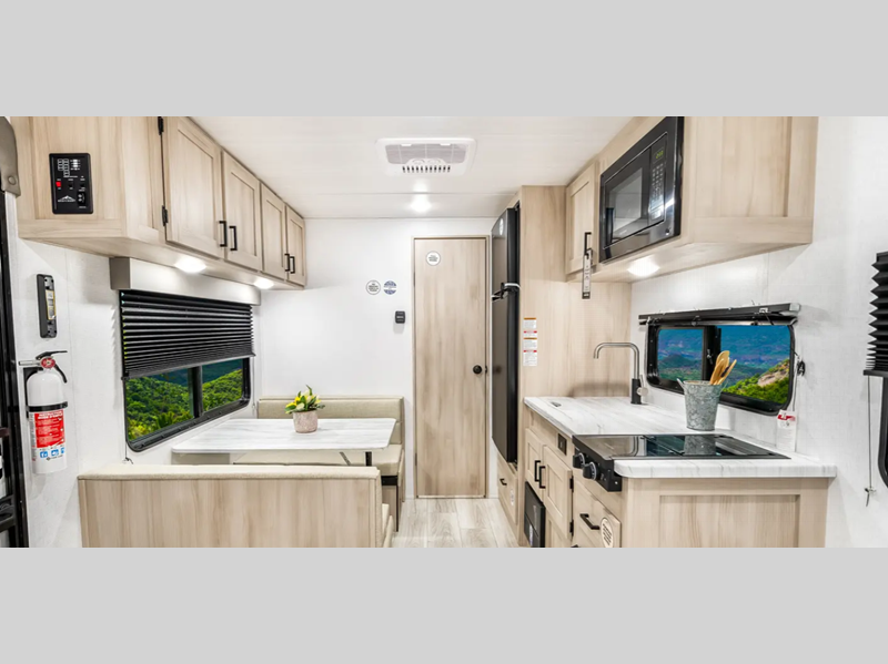Each model includes many at-home comforts, including seamless countertops with no T-mold, full bath and kitchen amenities, plus plenty of storage space for your belongings. There is an outside shower with hot and cold water, a power awning with an LED light, and a battery disconnect. Solar prep, ladder prep, and WiFi prep give you the ability to customize your trailer even more!
