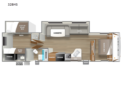 Each model is constructed with a fully enclosed underbelly, a PVC roof membrane, and gold reflective exterior windows that are sure to be eye-catching. The power tongue jack and power stabilizer jacks will have you set up in no-time, and the best-in-class drop frame pass-through storage means you can bring along extra camp gear. Inside, you'll find Congoleum flooring, seamless pressed countertops, a designer bedding package, and many more comforts.