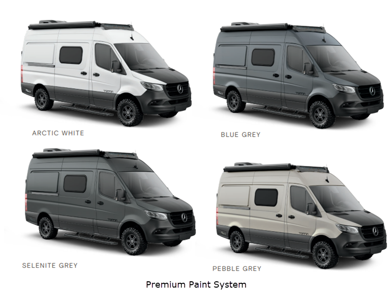 Sleeps 2 Length 19 ft 6 in Ext Width 7 ft 8 in Ext Height 10 ft Int Height 6 ft 3 in Interior Color Stargazer Exterior Color Blue Grey, Arctic White, Selenite Grey, Pebble Grey Hitch Weight 5000 lbs GVWR 9050 lbs Fresh Water Capacity 26 gals Grey Water Capacity 22 gals Black Water Capacity 4.5 gals Tire Size LT 245/70R 17 Fuel Type Diesel Engine 2.0L 4-Cylinder Twin Scroll Turbo Chassis Mercedes-Benz 2500 Sprinter Cargo Van AWD Horsepower 208 hp Fuel Capacity 24.5 gals Torque 332 ft-lb Refrigerator Type 12 Volt Refrigerator Size 3.1 cu ft Cooktop Burners 1 Shower Size 24" x 36" Number of Awnings 1 Water Heater Type Hydronic AC BTU 15000 btu Awning Info Girard Side Mount Power w/LED Lights Gross Combined Weight 13930 lbs Shower Type Wet/Bath Shower Electrical Service 30 amp Solar Wattage 220 watts